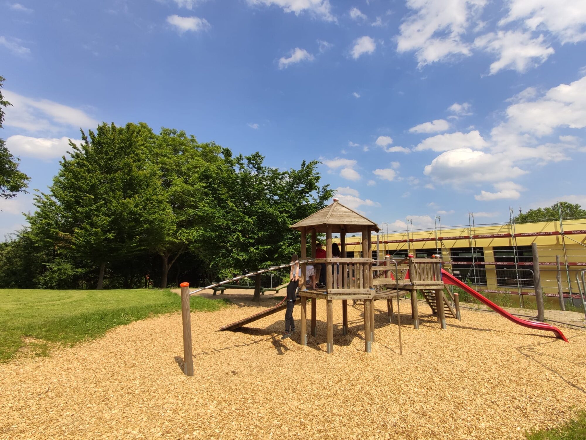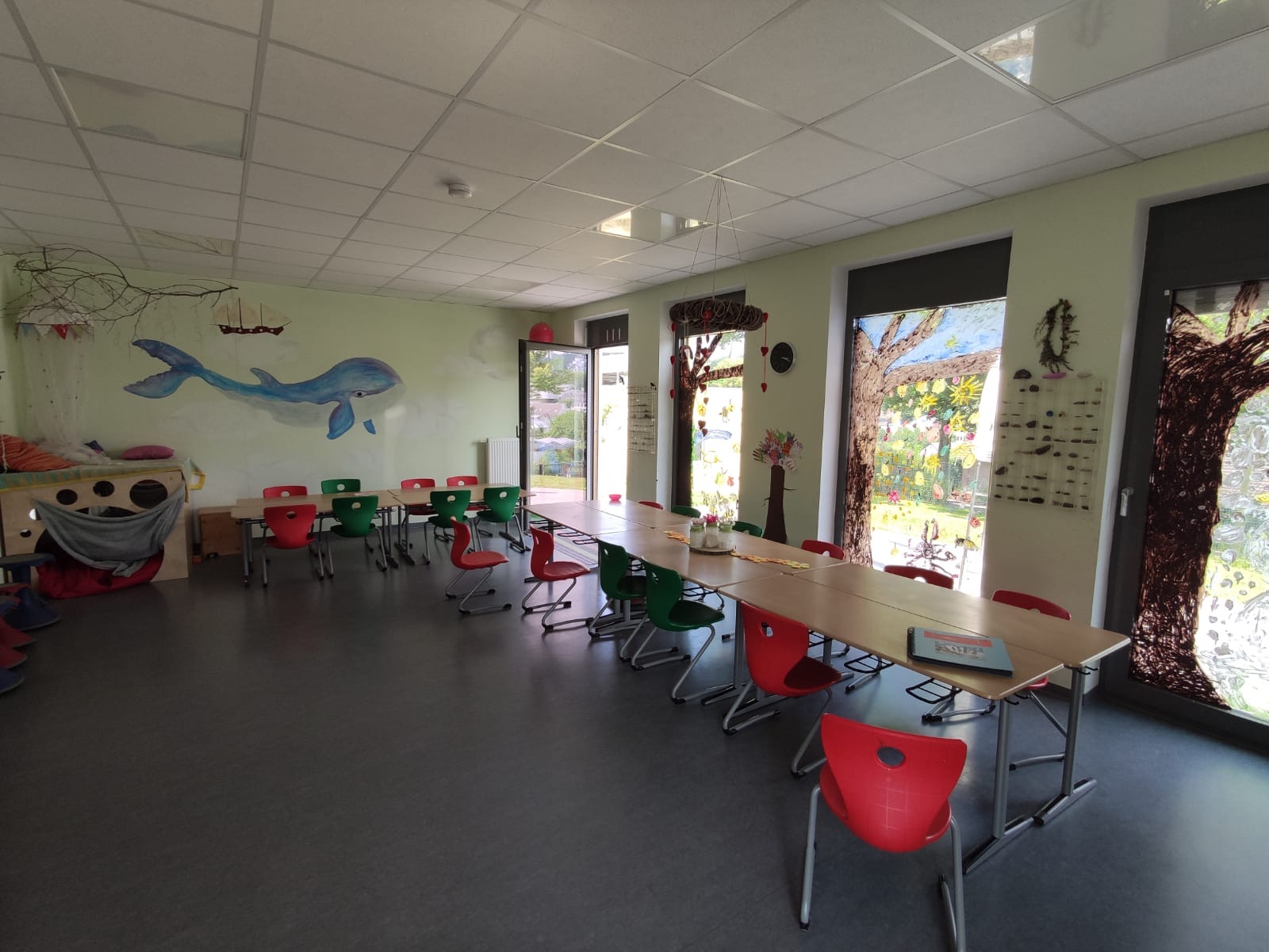 Neben drei großen Gruppenräumen stehen den Kindern hier ein großer Außenbereich mit Schulgarten zur Verfügung, der durch seine Kletter- und Spielmöglichkeiten zum Freispiel einlädt und den Kindern die Möglichkeit gibt, sich nach dem Unterricht beim Toben, Spielen und Erforschen zu erholen.