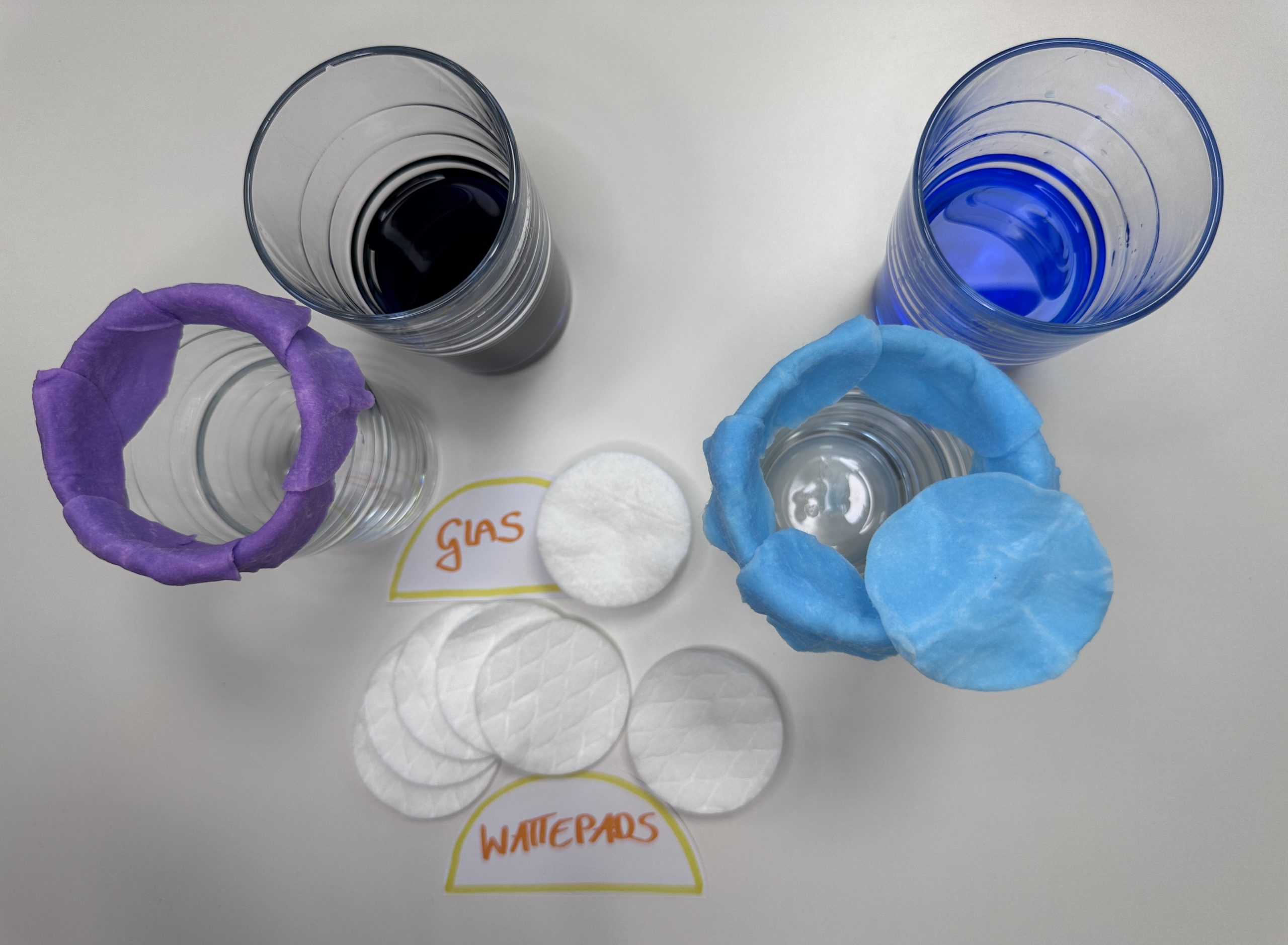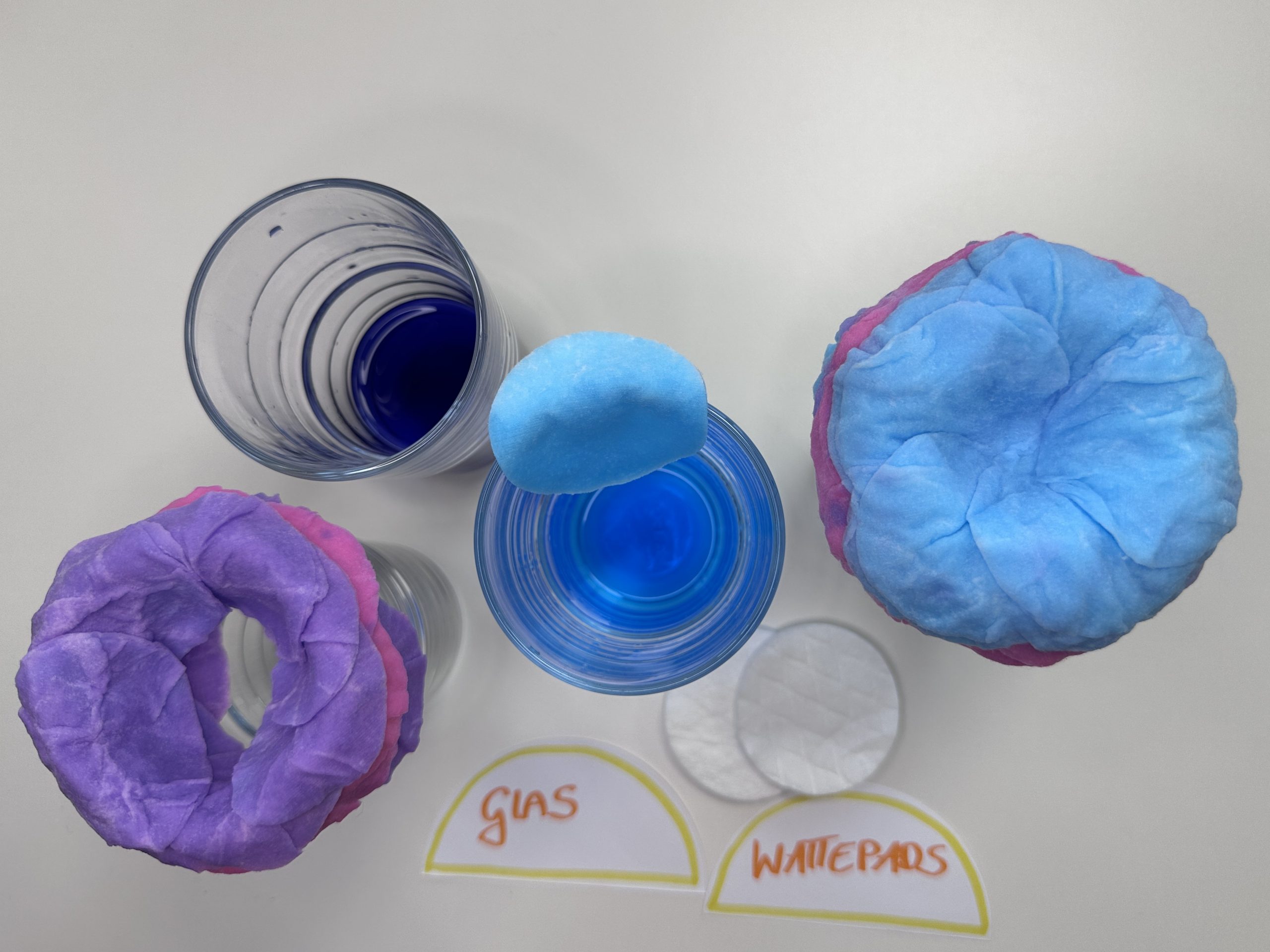 Wattepads auf das Glas legen: Lege das Wattepads vorsichtig oben auf die Öffnung des Glases. Die Wattepads werden jetzt reihum gelegt. Jede Reihe ragt dabei ein bisschen mehr in das Glas hinein. Wenn die Wattepads in der Mitte übereinanderliegen, ist die Blume fertig.